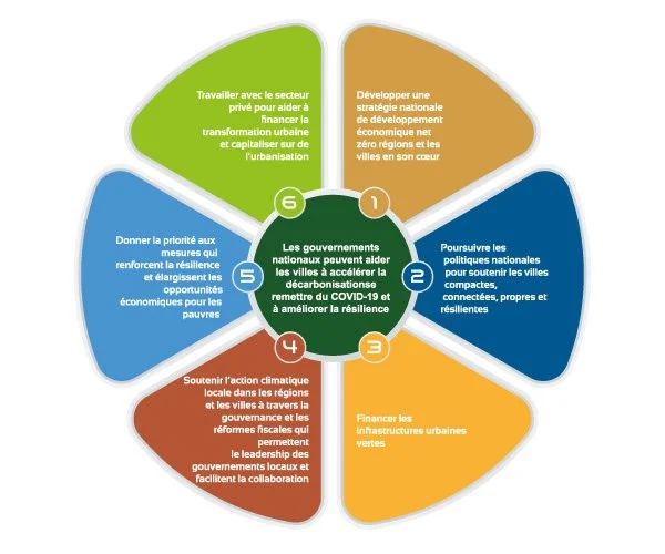 La Coalition for Urban Transitions souligne, dans une publication de 2021, que l’urbanisation offre une opportunité majeure pour accélérer la décarbonation post-COVID. Dans six grandes économies émergentes (Chine, Inde, Indonésie, Brésil, Mexique, Afrique du Sud), des mesures déjà disponibles pourraient réduire les émissions urbaines de 87 à 96 % d’ici 2050, bien au-delà des engagements actuels. Pour y parvenir, les villes doivent être pleinement soutenues par les gouvernements nationaux et activer six leviers stratégiques essentiels.